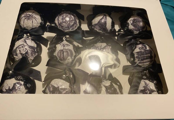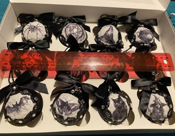 Made to Order. This listing is for 12 of the baubles shown in the pictures. They come presented in a box. These are perfect either as Gothic Halloween tree bauble decorations or for Christmas/Gothmas/Hexmas. Or as Gothic Decorations for your home or as a gift for someone who would love them. The baubles are shatterproof and 6cm in size. Gothic decoupage designs, acrylic paints, textural paste, and the embellishments as shown are used. Strong glue securely holds the black lace and flat backed gemstones. Two coats of a lovely hardwearing varnish was used over the whole of the baubles to give a beautiful finish.