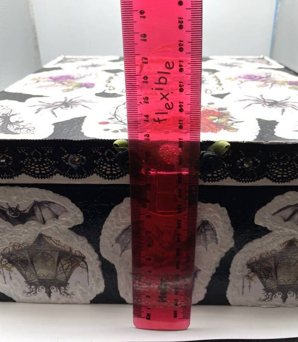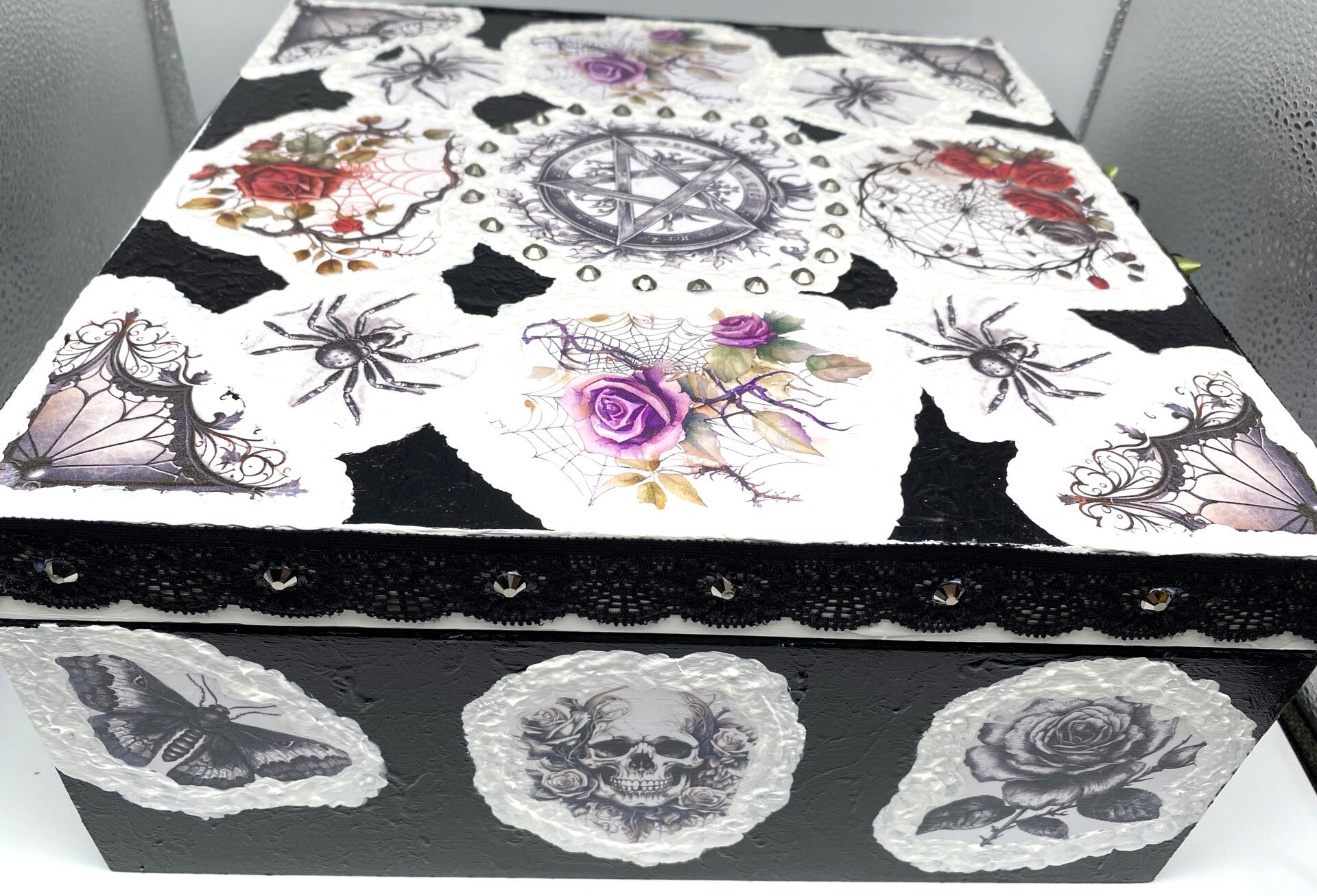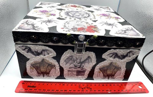 The dimensions can be seen in some of the pictures. Acrylic paints, gothic decoupage designs, and white modelling paste are used, along with the embellishments shown. I will add a layer of black velvet felt inside the box. Hardwearing gloss varnish will coat the whole of the box giving it a beautiful finish. Inside the box on the underside of the Lid there is an area there where I can personalise with either a saying you would like added, or a Name or other special words. I could even add an image you want included if you do want that just attach an image and I can print it on rice paper then decoupage it and give it a lovely gloss finish.