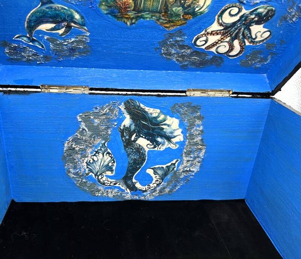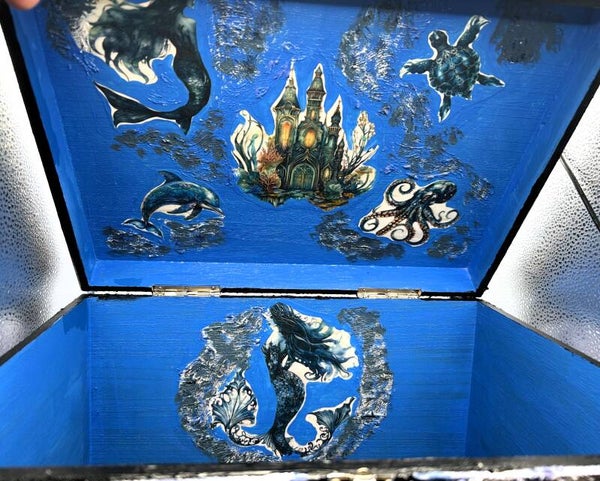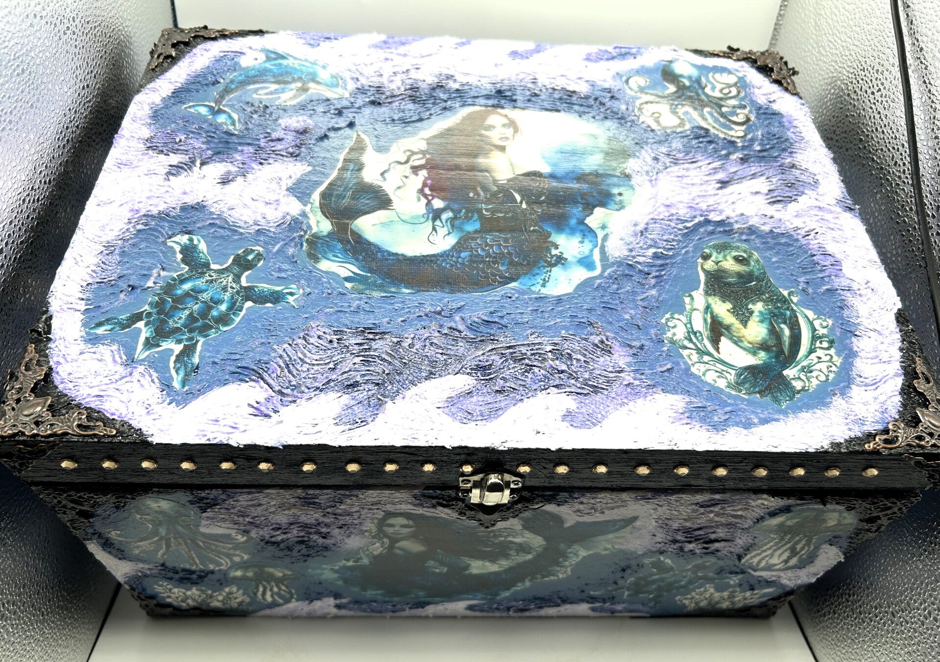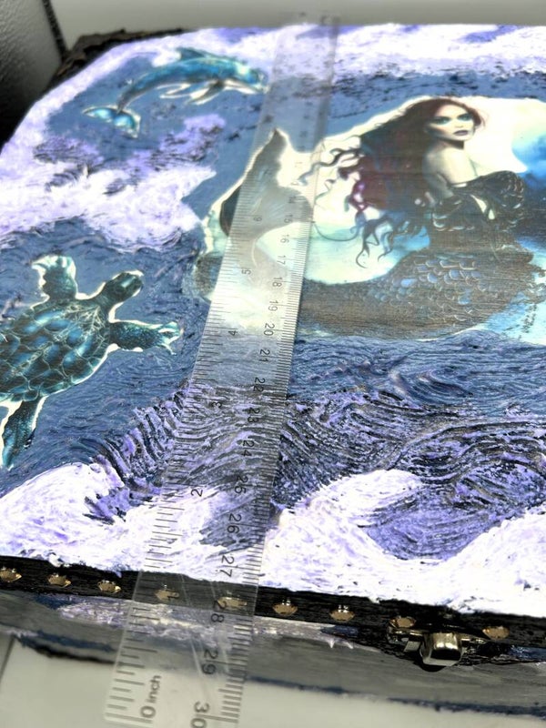 I used a decoupage technique to decorate this wooden box with beautiful Gothic Dark Siren/mermaid and sea life designs purchased through a couple fellow Etsy shops called RomanticCryptidChron and Giraffe Creative. They have some lovely designs available. Then, I print these designs on special decoupage rice paper and use a decoupage technique to attach them to the beautiful unfinished wooden XXL box I sourced. The textural sea effect to the outside of the box is done using a special white modelling paste with added acrylic paint colours to it along with other acrylic paints as shown. Added antique metal corner embellishments and flat backed pale gold round gemstones. There will be a black velvet felt layer on the base of the box and inside the box. Lastly, two coats of gloss varnish added giving a rich beautiful protective finish.