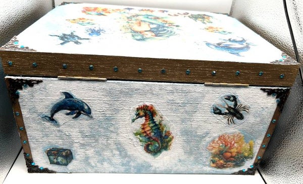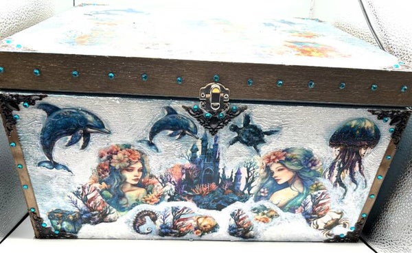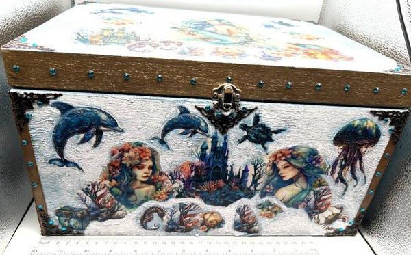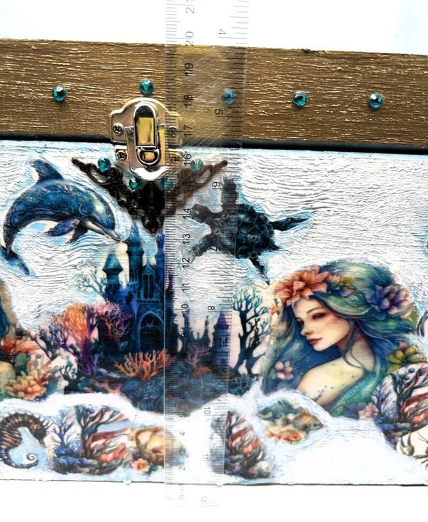 I use a decoupage technique to decorate this wooden box with beautiful mermaid and sea life designs I purchased through a couple fellow Etsy shops called UniqueArtFactory and GiraffeCreative. They have some lovely designs available. Then, I printed these designs on special decoupage rice paper and used a decoupage technique to attach them to the beautiful unfinished wooden XXL box I sourced. I wanted to give a textural sea effect to the outside of the box which I do by using white modelling paste with added acrylic paint colours to it. Then used other acrylic paints as shown, along with antique metal corner embellishments and flat backed turquoise round gemstones. There is a black velvet felt layer on the base of the box and inside the box. Lastly, two coats of gloss varnish are added giving a rich beautiful protective finish.
